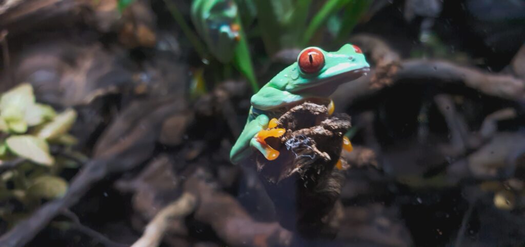 Frente al acuario se encuentran los terrarios que acogen a los reptiles y anfibios. En el primero encontramos diez ranas de ojos rojos, un atractivo anfibio de las selvas tropicales que destaca por sus vivos colores: unos grandes ojos brillantes, patas de color naranja y costados azules y amarillos. Los utiliza para asustar a sus depredadores y él, a su vez, es carnívoro nocturno, por lo que activan mucho más a última hora del día.