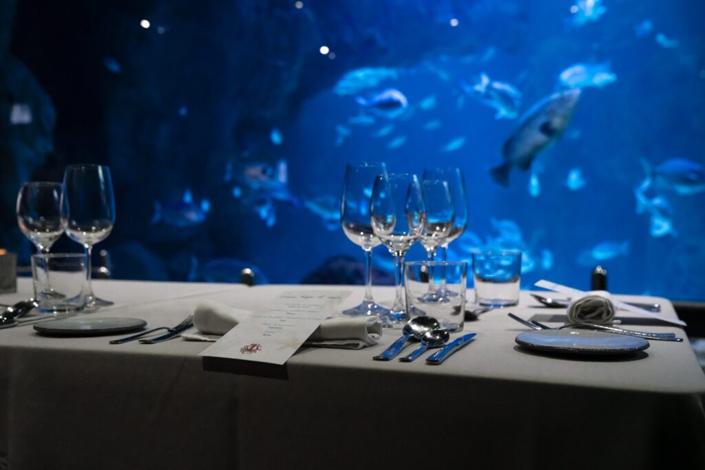 Un menú de lujo en compañía de tiburones, rayas, morenas y tortugas gigantes, unos exóticos compañeros de mesa que harán de tu noche una experiencia inolvidable.
